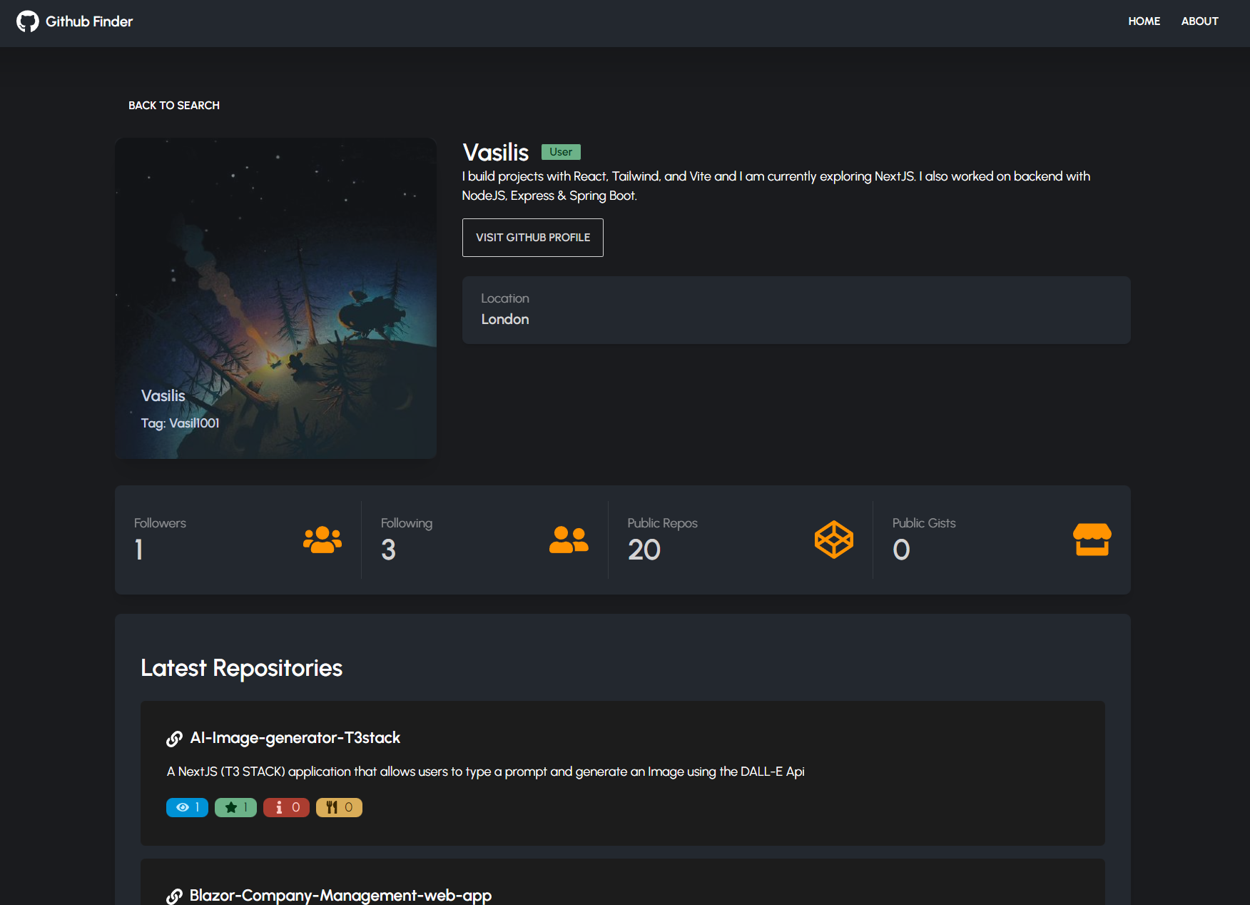 A project that uses GitHub API to search for profiles and display information about them like latest repositories.